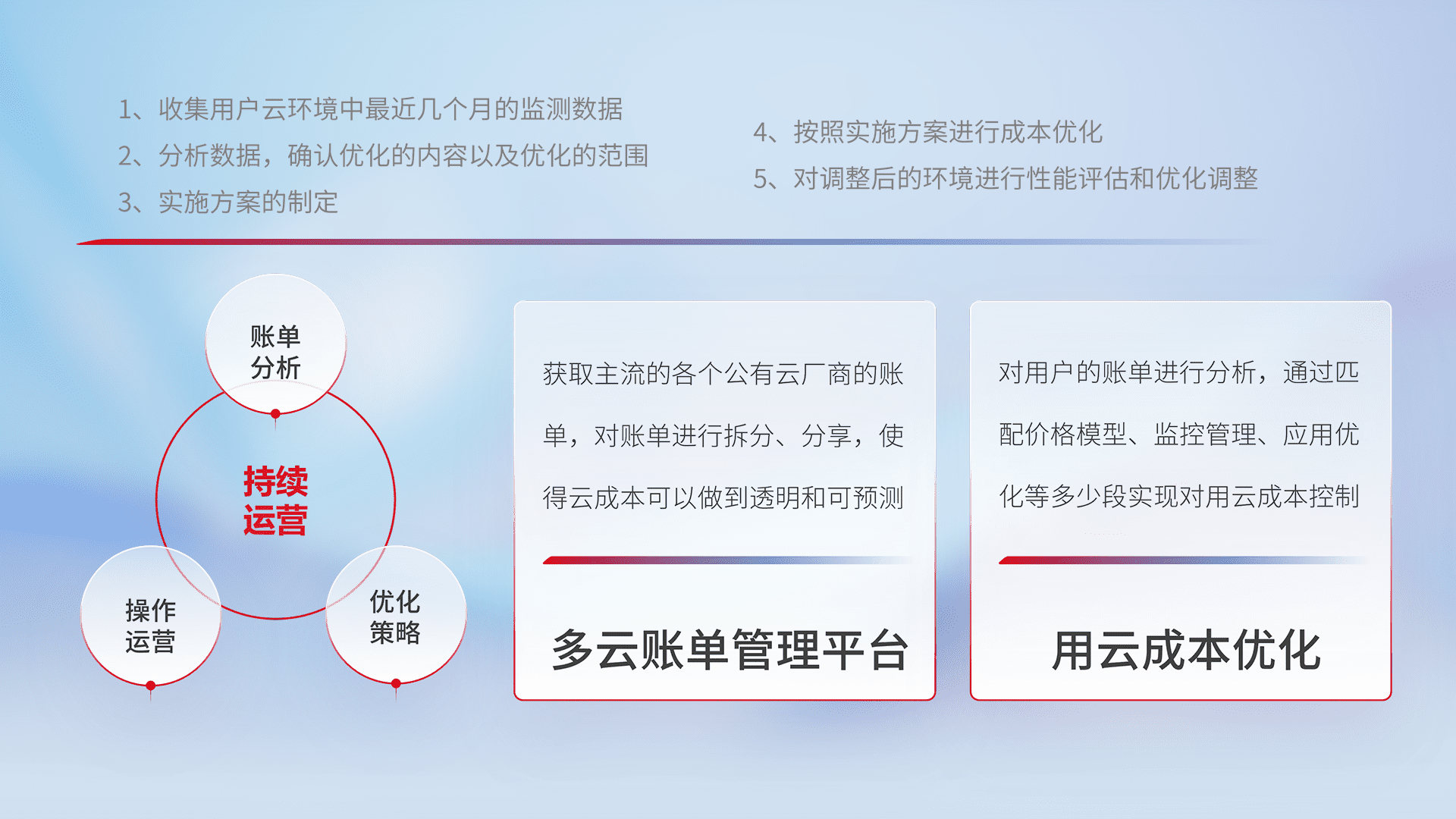 通过多云纳管,,,,以统一的资源数据模型把客户的云资源进行抽象和封装,,进而实现对多云资源的统一操作,,,保障云资源管理的可靠性、、、、稳定性与可用性。。。量身定制化运维内容,,配置、、、开发运维、、补丁管理、、、、备份、、、监控、、、、认证和访问管理、、审计和日常巡检等,,保障在用云过程中的可靠度,,稳定度以及高可用率。。。